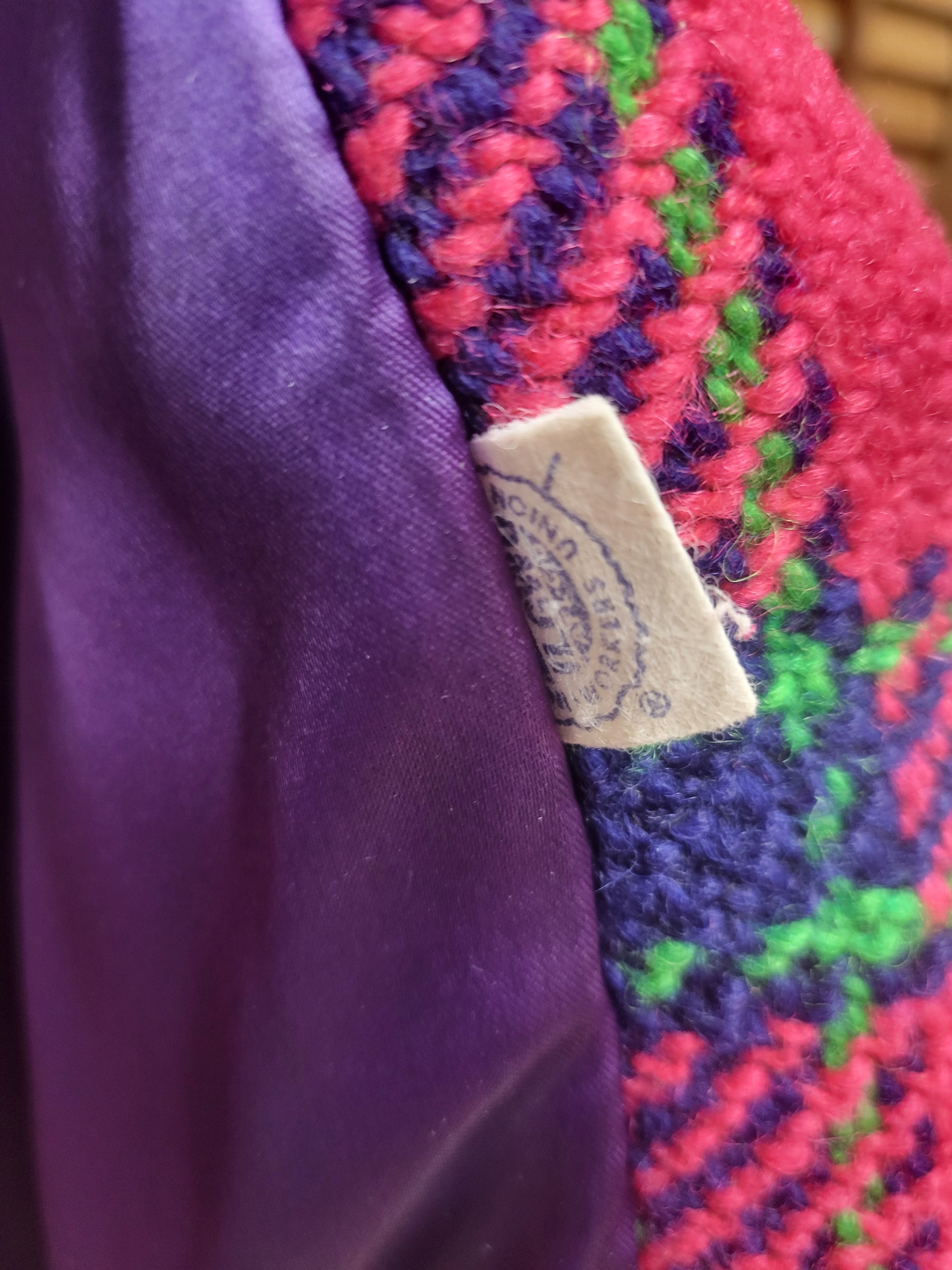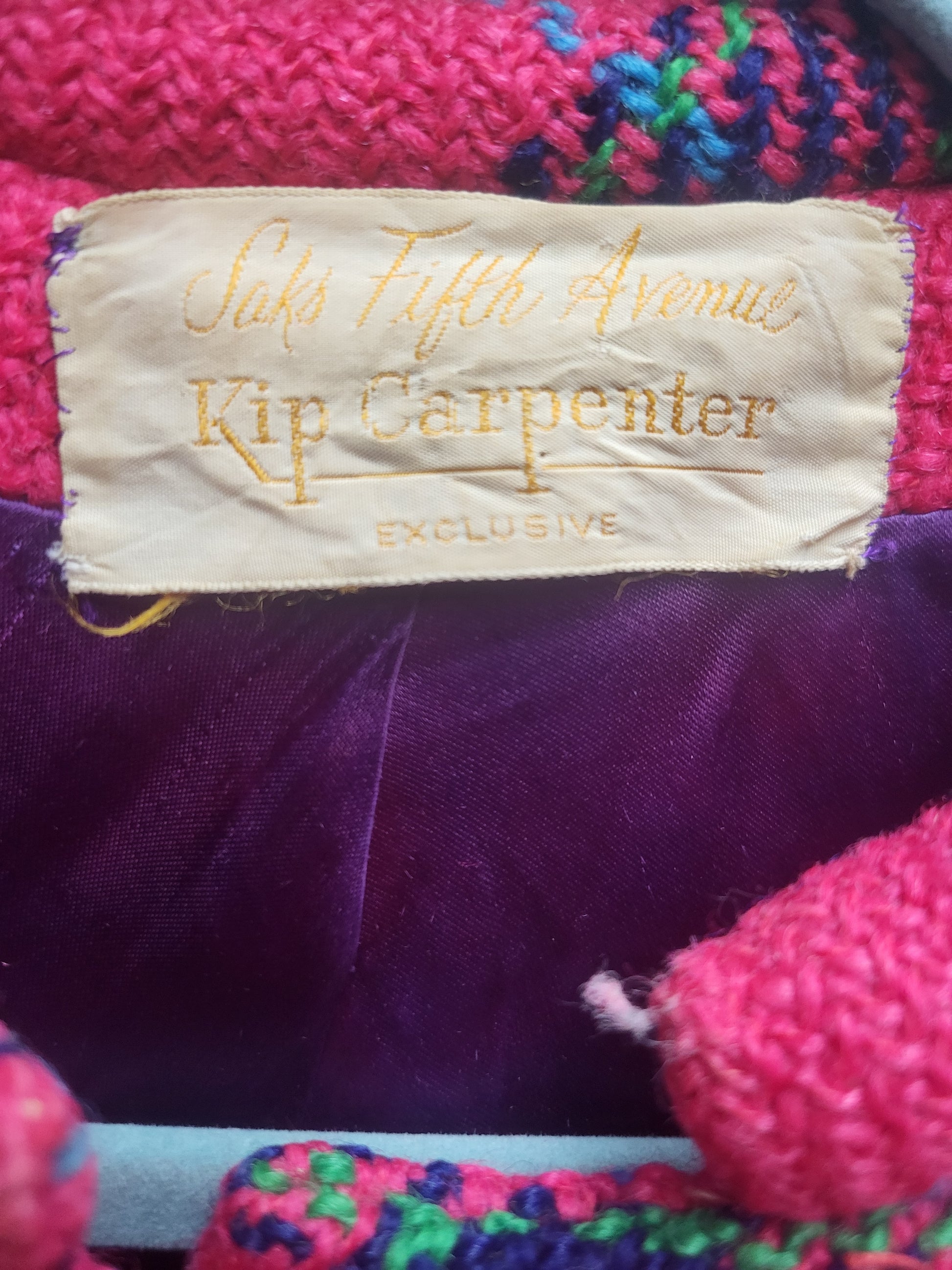 This 1970's Saks Fifth Avenue Kip Carpenter exclusive jacket showcases a distinctive pink and purple plaid pattern, expertly tailored with a lined interior for added comfort. Featuring a front closure with four latching buttons and practical pockets, it combines vintage aesthetics with functional design, making it a refined choice for collectors and enthusiasts of period fashion.