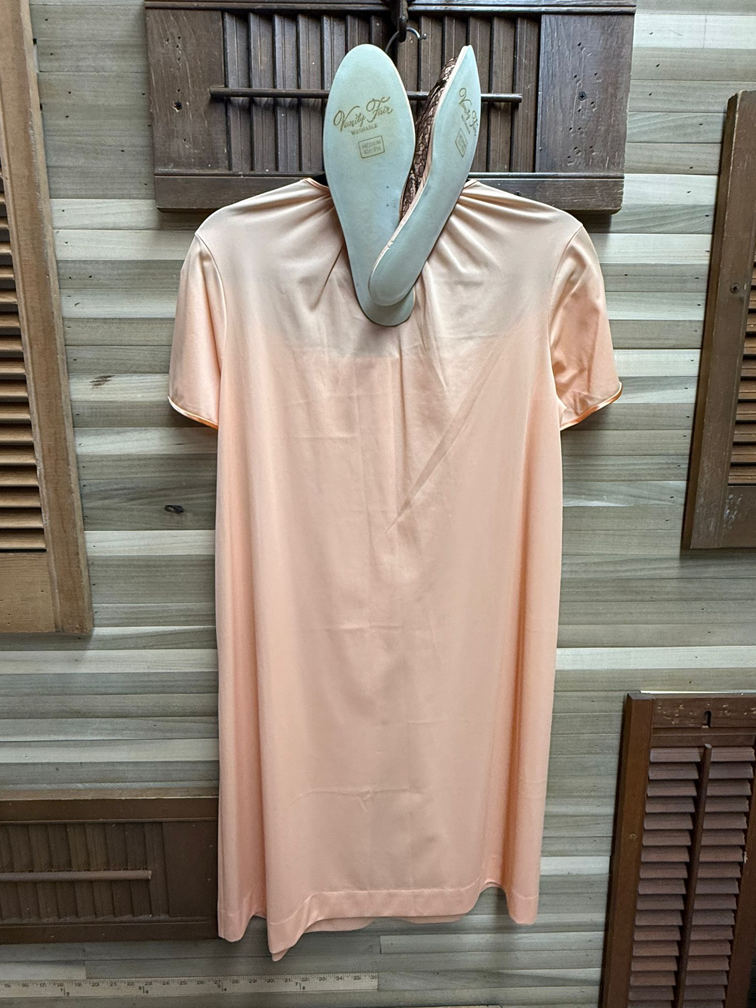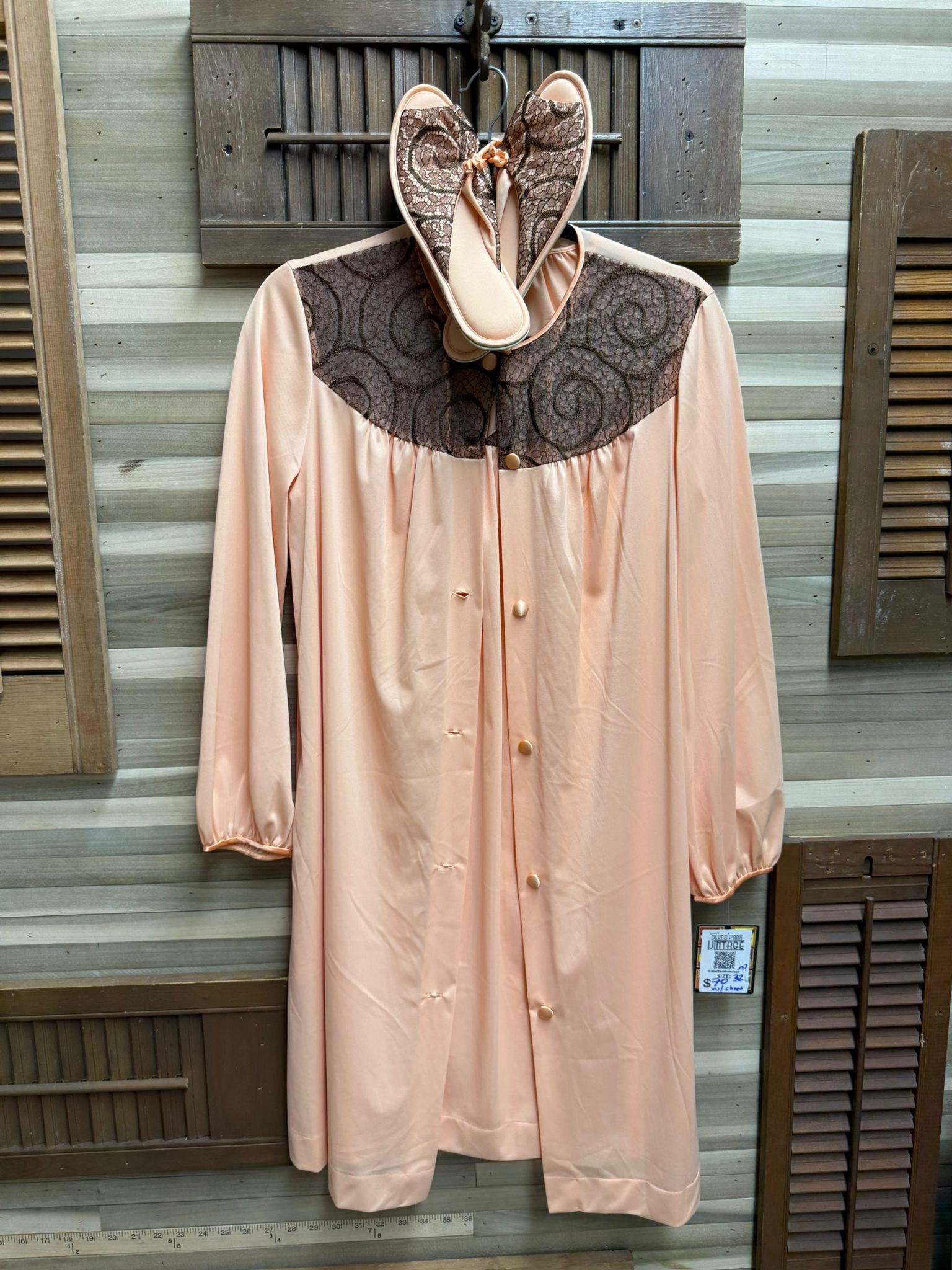 1970's Vanity Fair Peach with Brown Lace Nightgown, Cover, and Matching slippers Size Small