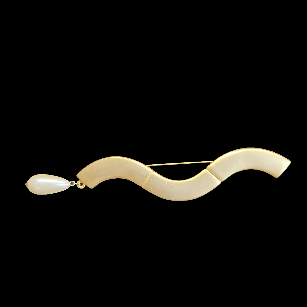 This elegant brooch features a sleek brush gold plating, adding a touch of vintage charm. The wavy design and faux pearls provide a unique and stylish touch, perfect for formal or everyday wear. Measuring at 4 ½ inches long, it is versatile and eye-catching.