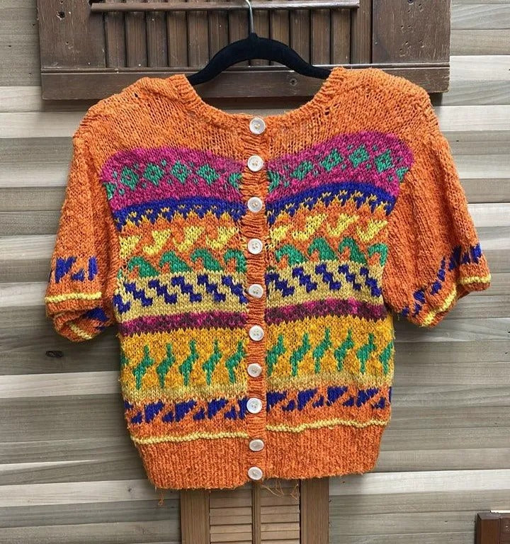Add a pop of color to your wardrobe with this chunky multicolored knit top. Its playful blend of vibrant hues and cozy texture brings fun to every outfit, while the short sleeves keep it light and breezy. Perfect for layering or wearing solo, this size small piece combines comfort and cheer in one stylish package.