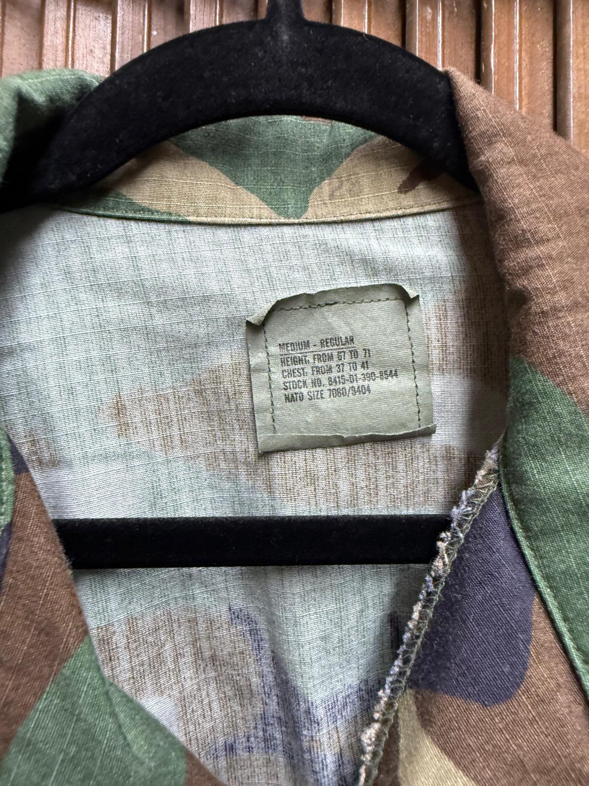 Originally put into service in 1994, this Genuine United States Air Force Dress Uniform (BDU) Woodland Camo Top features authentic patches and reflects the historical design used by Airmen. Constructed for durability and camouflage effectiveness, it offers reliable wear suitable for collectors or reenactors seeking an accurate representation of the period-issued uniform.