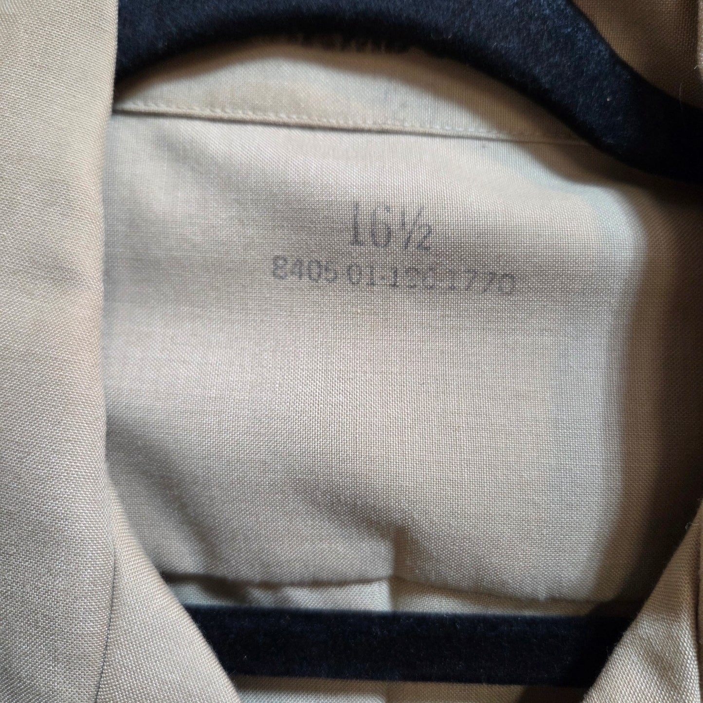 This authentic 1970’s US Marine Corps khaki short sleeve dress shirt features distinct Staff Sergeant patches and a size Large with a 16.5-inch neck. Crafted to military specifications, it offers durability and comfort while reflecting vintage military style. Ideal for collectors or those seeking genuine period apparel, this shirt combines historical significance with everyday wearability.