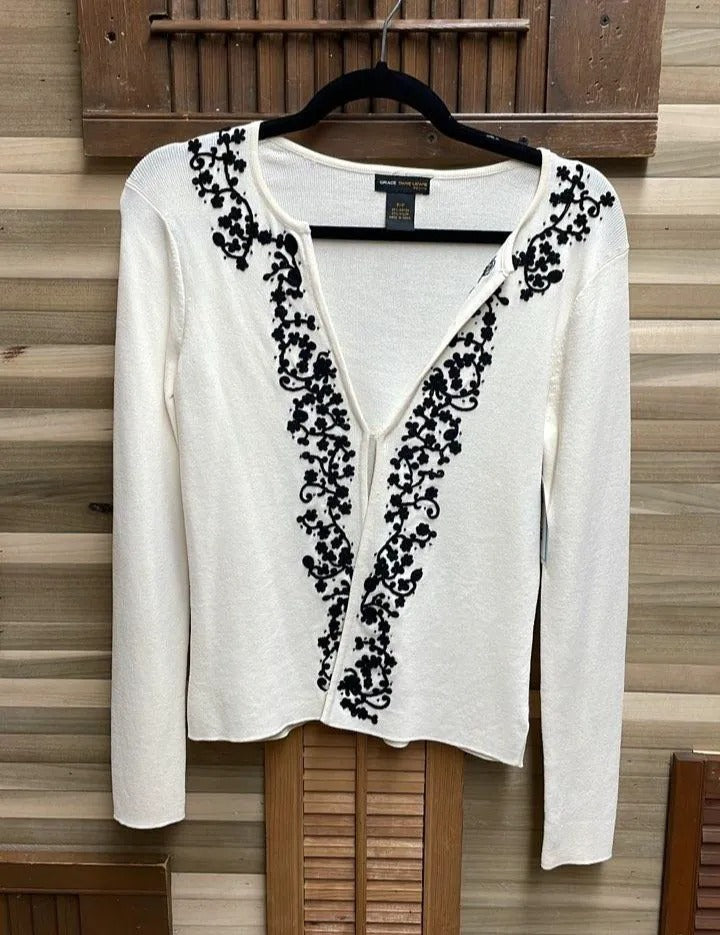 Y2K "Grace Dane" White Cardigan with Embroidered Black Floral Details